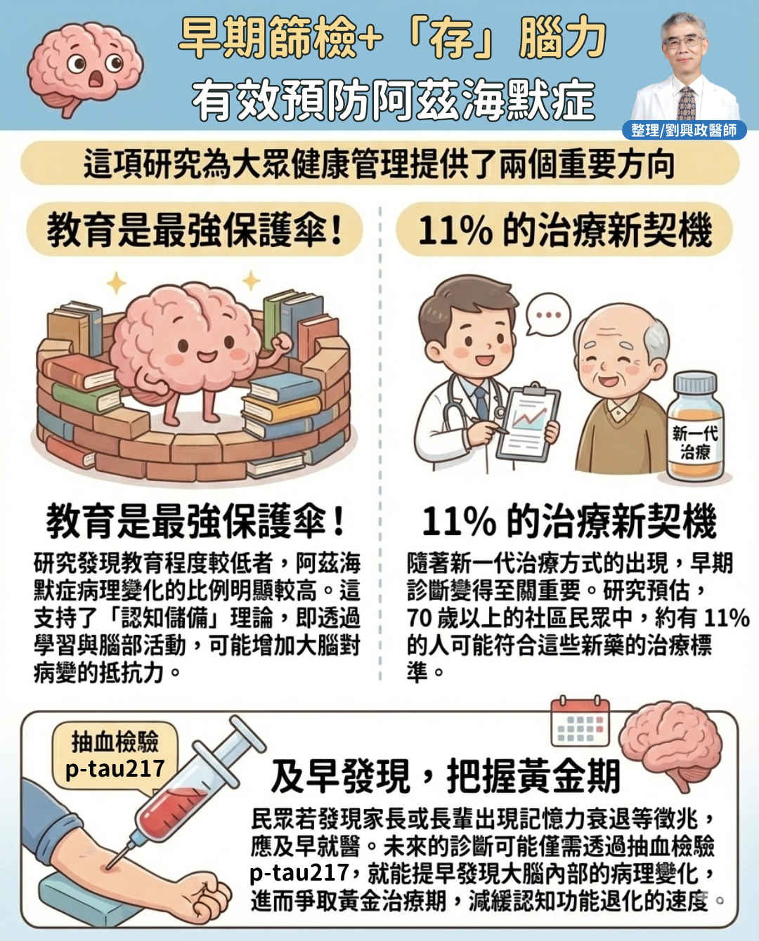 民眾若發現家長或長輩出現記憶力衰退等徵兆,應及早就醫。未來的診斷可能僅需透過抽血檢驗 pTau217,就能提早發現大腦內部的病理變化,進而爭取黃金治療期,減緩認知功能退化的速度 。