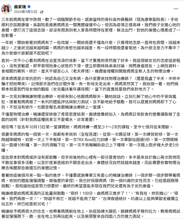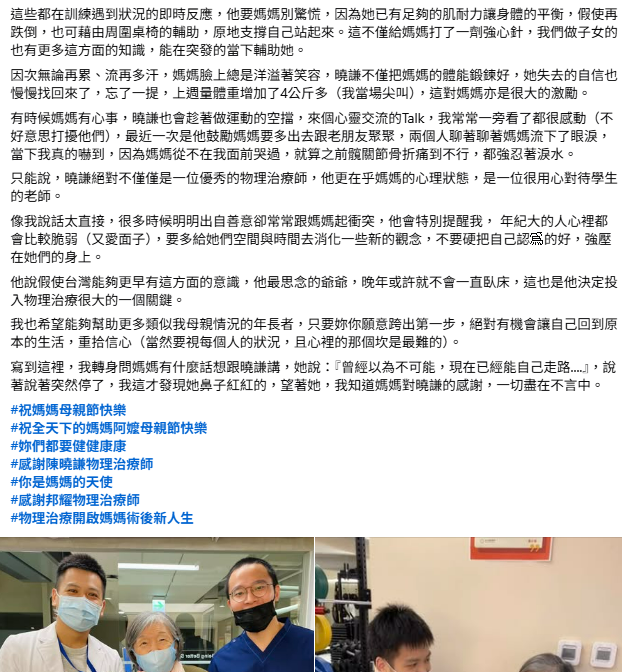 曲家瑞老師分享帶媽媽至加力運動醫學訓練心得,開啟髖關節術後新人生