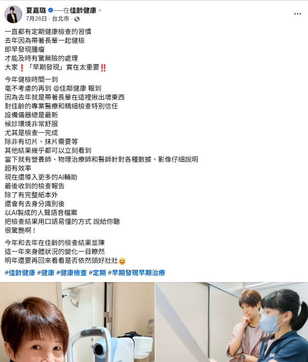 夏嘉璐主播臉書貼文分享,去年在 佳齡健康 健檢時,即時發現腫瘤,順利處理,更加感受到「早期發現」的重要性。