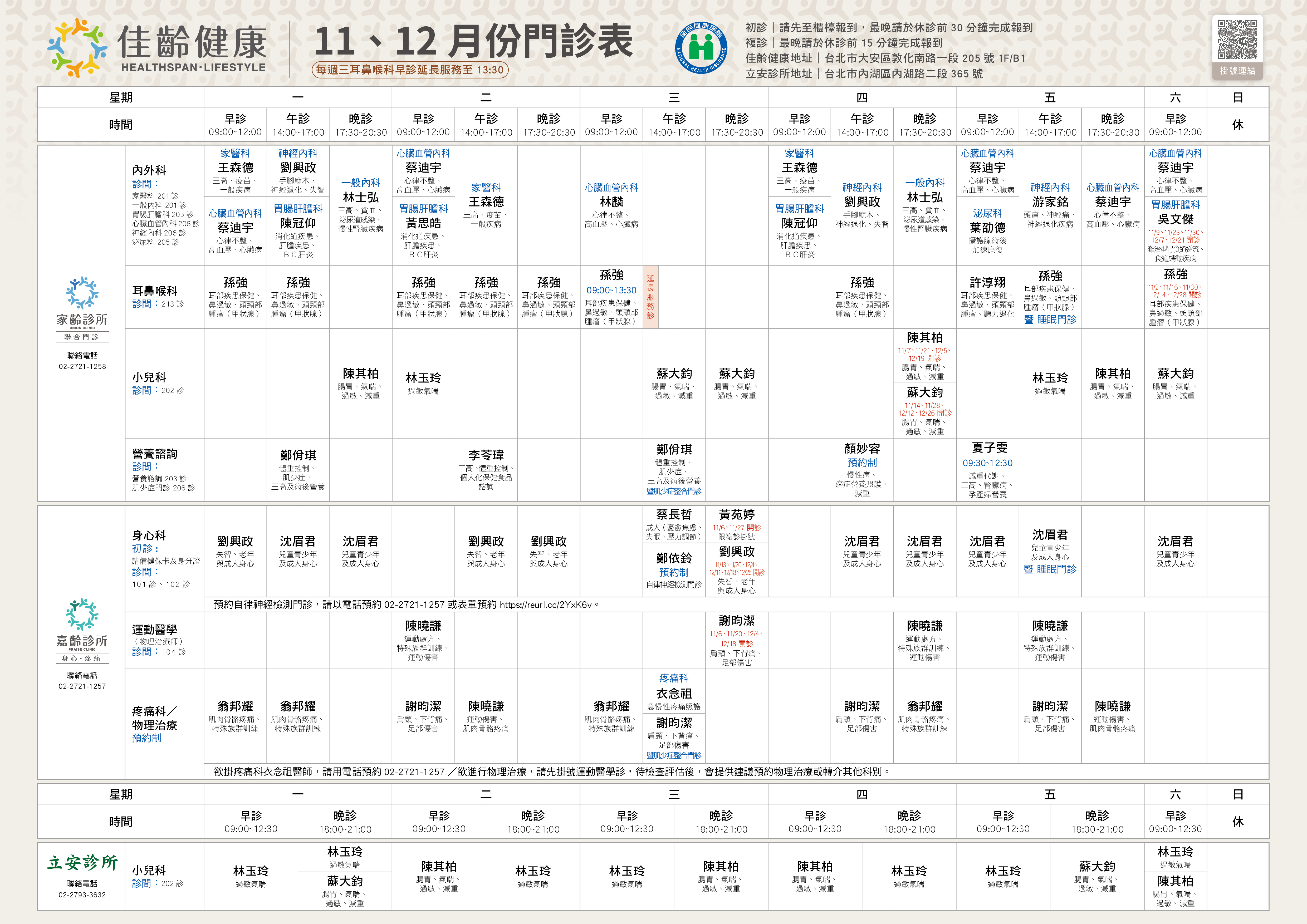【家齡&嘉齡&立安診所】2024年11-12月門診表