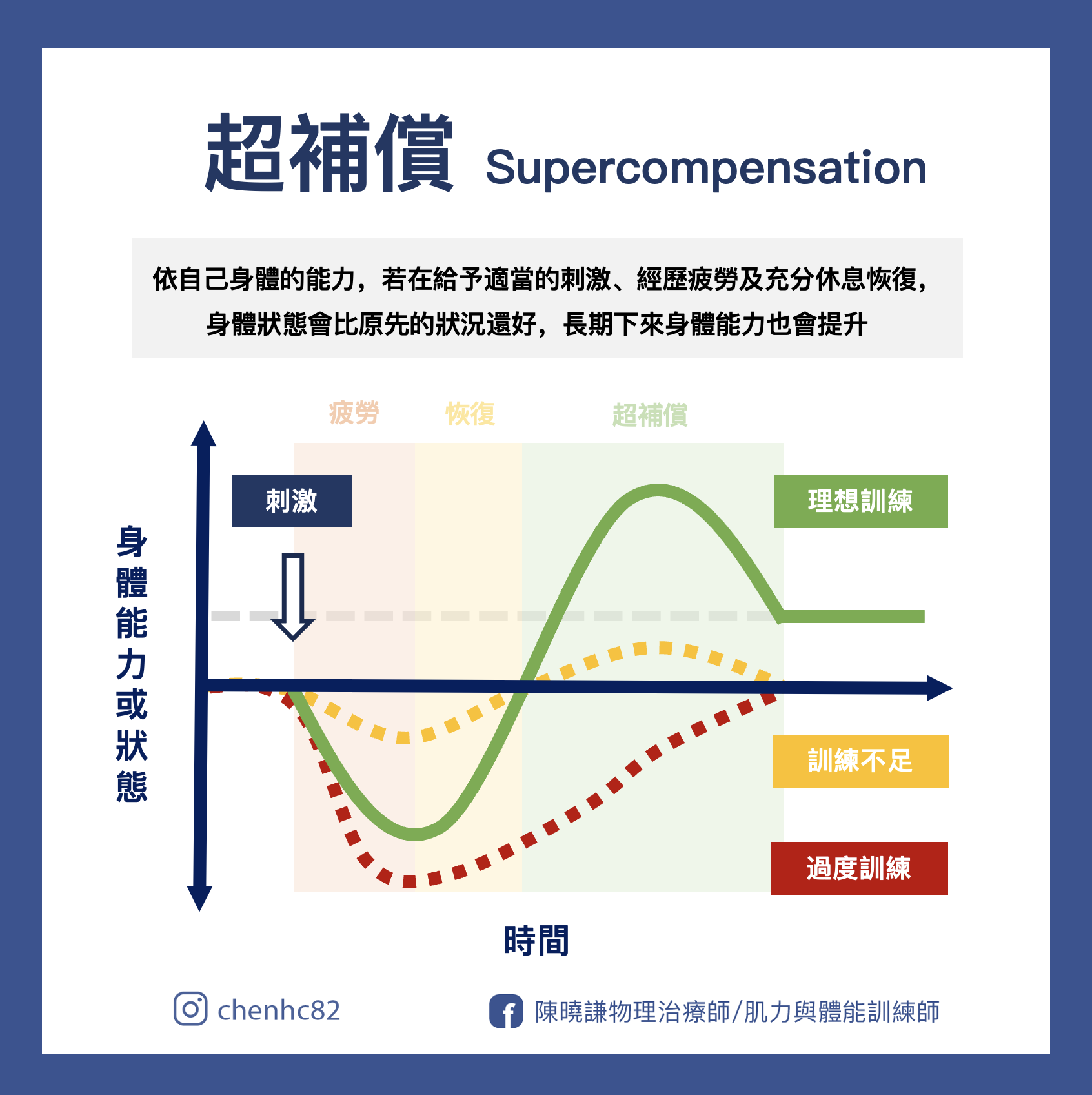 運動傷害常常是發生在所從事的活動跟自身能力落差太大時,舉例來說,若是規律接受專業訓練的運動員或是業餘跑者,可能跑20K對他來說可能只是一次的訓練量,但反過來說,對一個沒有運動習慣的人,可能一次跑5K就全身痛一個禮拜,因此一個理想的運動強度或運動量,也取決於自身的能力,著名的超補償(Supercompensation)原則即是在敘述當身體接受一個運動或訓練的刺激,若有「適當」的刺激加上「適當」的修復,身體的能力就會進步,但過高的運動強度或運動量,配上不足的休息,時常導致的就是過度訓練(Overtraining),常會有免疫力下降、增加疾病感染機率等狀況。