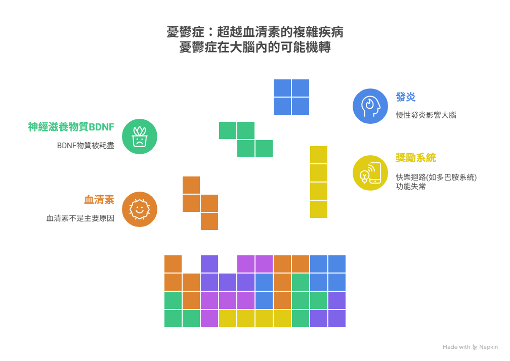 越來越多證據顯示,憂鬱症可能是一種低度的慢性發炎狀態,而影響腦部的功能。這不只是情緒問題,而是全身的免疫和代謝系統都牽連在內。